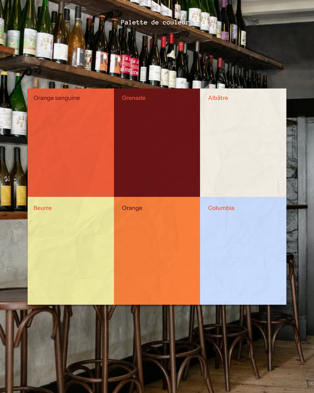 Une palette solaire et fun qui reprend quelques couleurs du secteur viticole mais qui reste moderne en saturant les nuances et en créant une palette secondaire vintage et joyeuse qui vient balancer le tout.