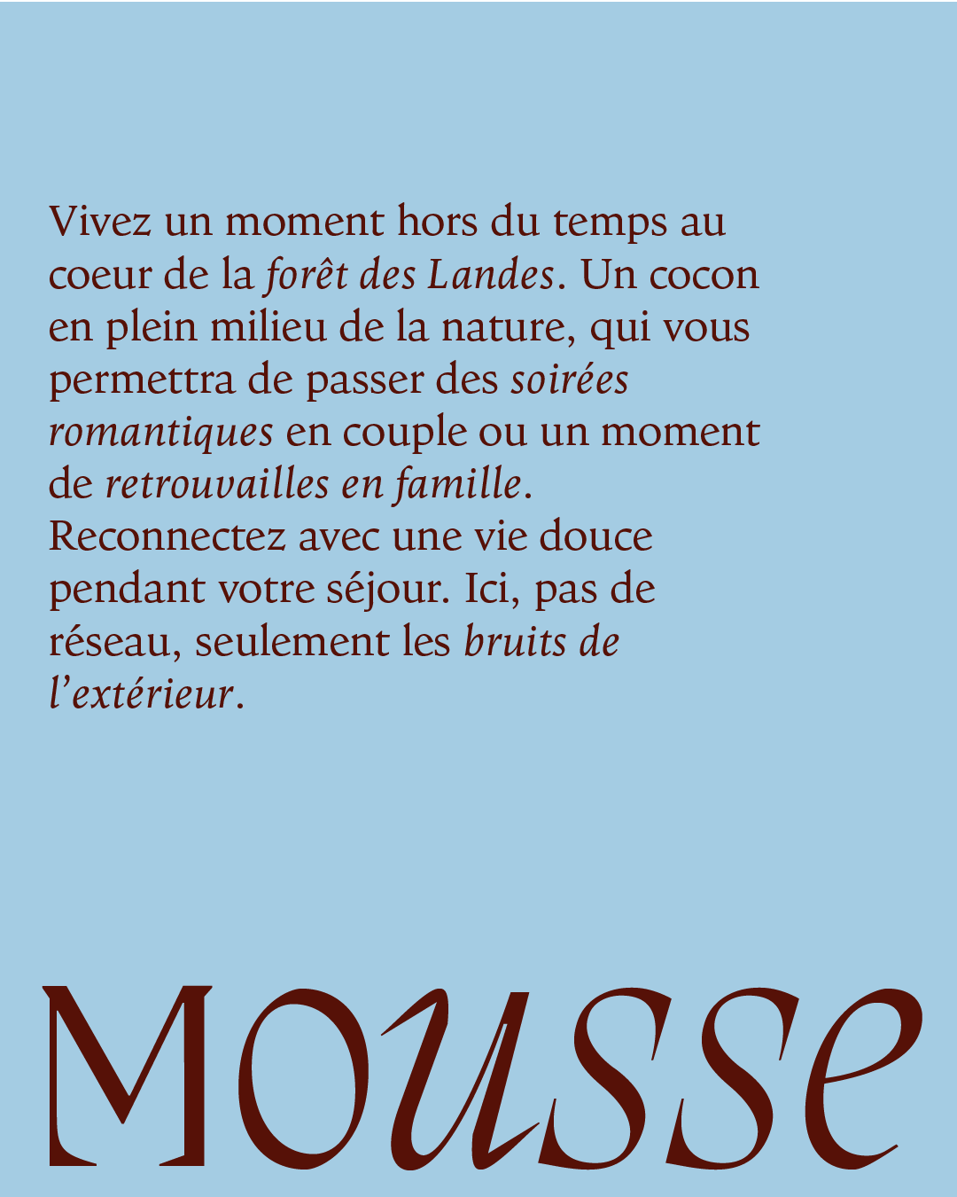 Pour la baseline, une typographie originale mélangeant lettres capitales et minuscules. Elle apporte du contraste au logo et reflète un côté plus brut, en écho à la nature et au bois.
